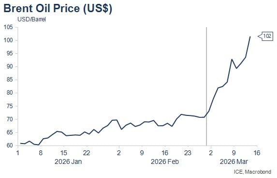 It was a slightly less volatile week, but the key trends we noted at the onset of hostilities remain in place. Oil prices have continued to rise but have yet to re-achieve the intra-day panic highs near $120pb of last Monday. Equity prices have continued to fall, while bond yields have also risen as markets price higher inflation in the near term. More substantial rises in oil prices will occur the longer the Strait of Hormuz remains closed, as will equity price declines, while a tipping point for bond yields and energy prices would likely occur somewhere above $125pb.